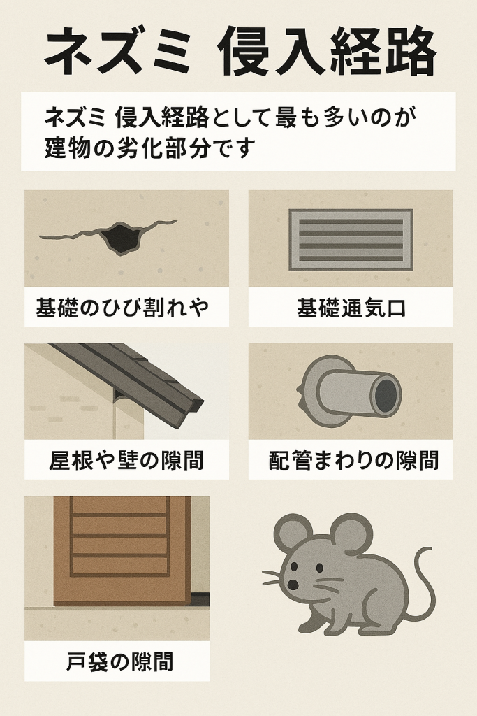 ネズミは 1.5cmの穴があれば侵入可能 とされ、築年数が経つほど侵入口が増えます。