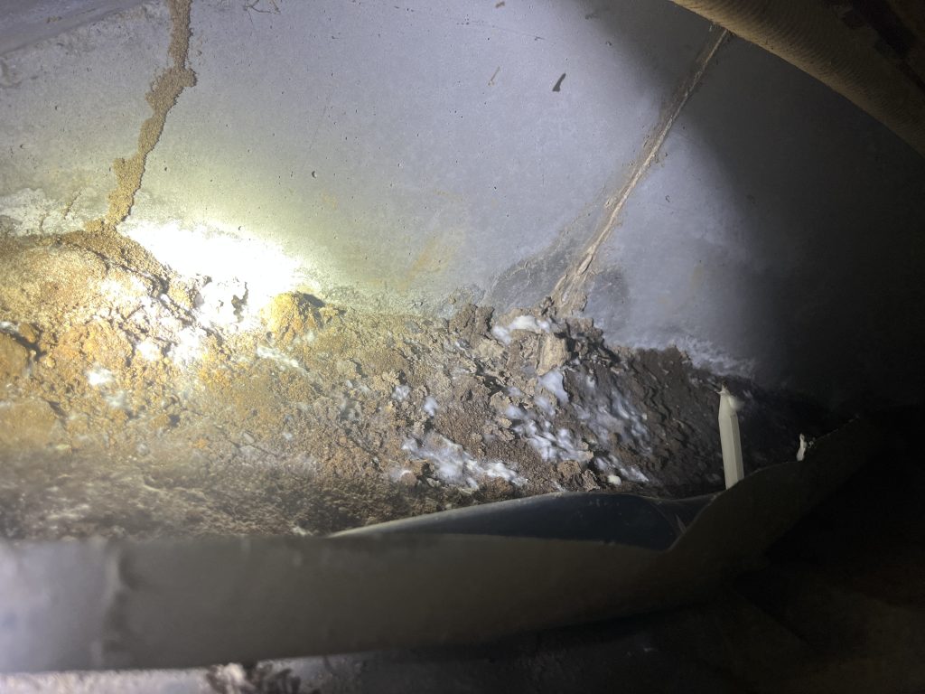さらに床下に潜ると、強いカビ臭が漂っていました。床下には調湿シートが敷き詰められていましたが、めくると湿った土壌とびっしり生えたカビが確認できました。